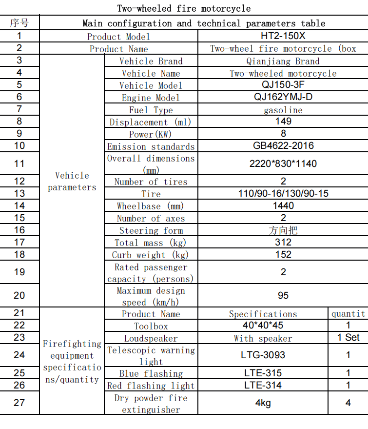 ఆల్-టెర్రైన్ ఫైర్ఫైటింగ్ మోటార్సైకిల్ అద్భుతమైన ఆఫ్-రోడ్ పనితీరును కలిగి ఉంది. ఇది కఠినమైన పర్వత రహదారులు లేదా ఇరుకైన వీధుల్లో అగ్నిమాపక మరియు రక్షణగా మరియు రక్షణగా ఉంటుంది. ఆకస్మిక అగ్ని ప్రమాదం జరిగితే, అగ్ని మూలాన్ని చల్లార్చడానికి ఇది 3 మందిని ఒక పోరాట బృందాన్ని ఏర్పాటు చేస్తుంది.